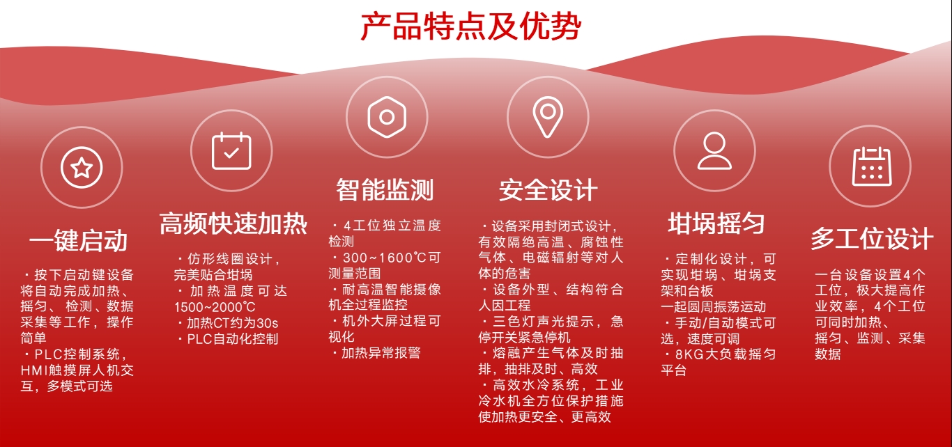 智能熔样机采用全自动高频电磁感应加热原理,整机配置有高频电磁加热模组、工业冷水机、振荡摇匀模组、红外测温模组、监控模组和高性能人机交互控制模组。功能上支持一键启动/停止、加热异常报警、4工位同步作业、可调速振荡摇匀、作业过程可视化、作业数据可追溯等多项核心,整机采用封闭式设计,制样过程中产生的有害气体通过排风管道进行过滤排放处理,高温辐射由深色玻璃隔离处理,保障作业人员处于一个安全健康的工作环境。