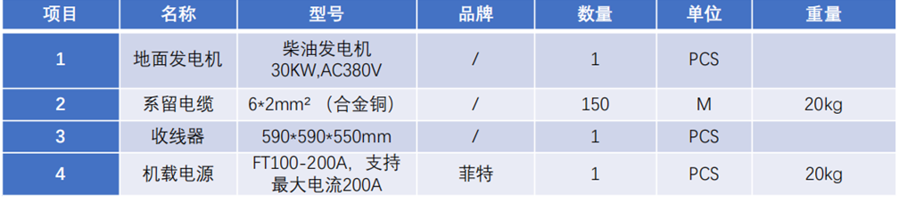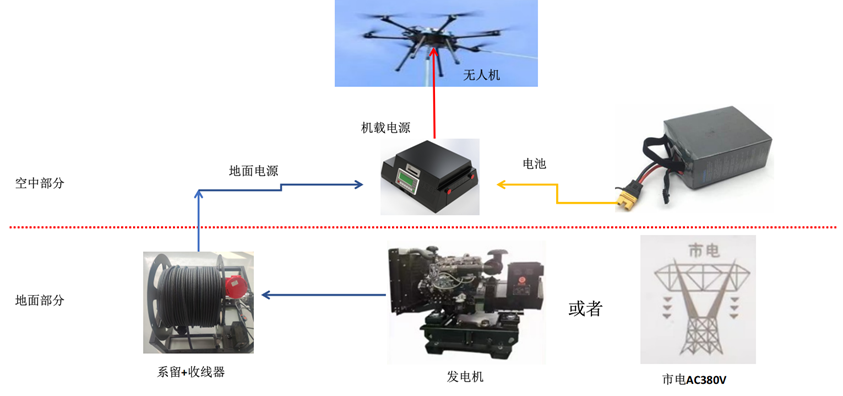 本无人机系留方案采用三相AC380V机载电源,供电方式采用地面电源与电池协同供电;并且无人机搭载的机载电源系统具有智能检测、自动切换功能。地面电源正常时,无人机由其供电;一旦地面电源断电或异常,自动切换器会自动切换到电池供电,维持无人机正常飞行与降落,避免供电故障引发事故,确保作业连续、安全。